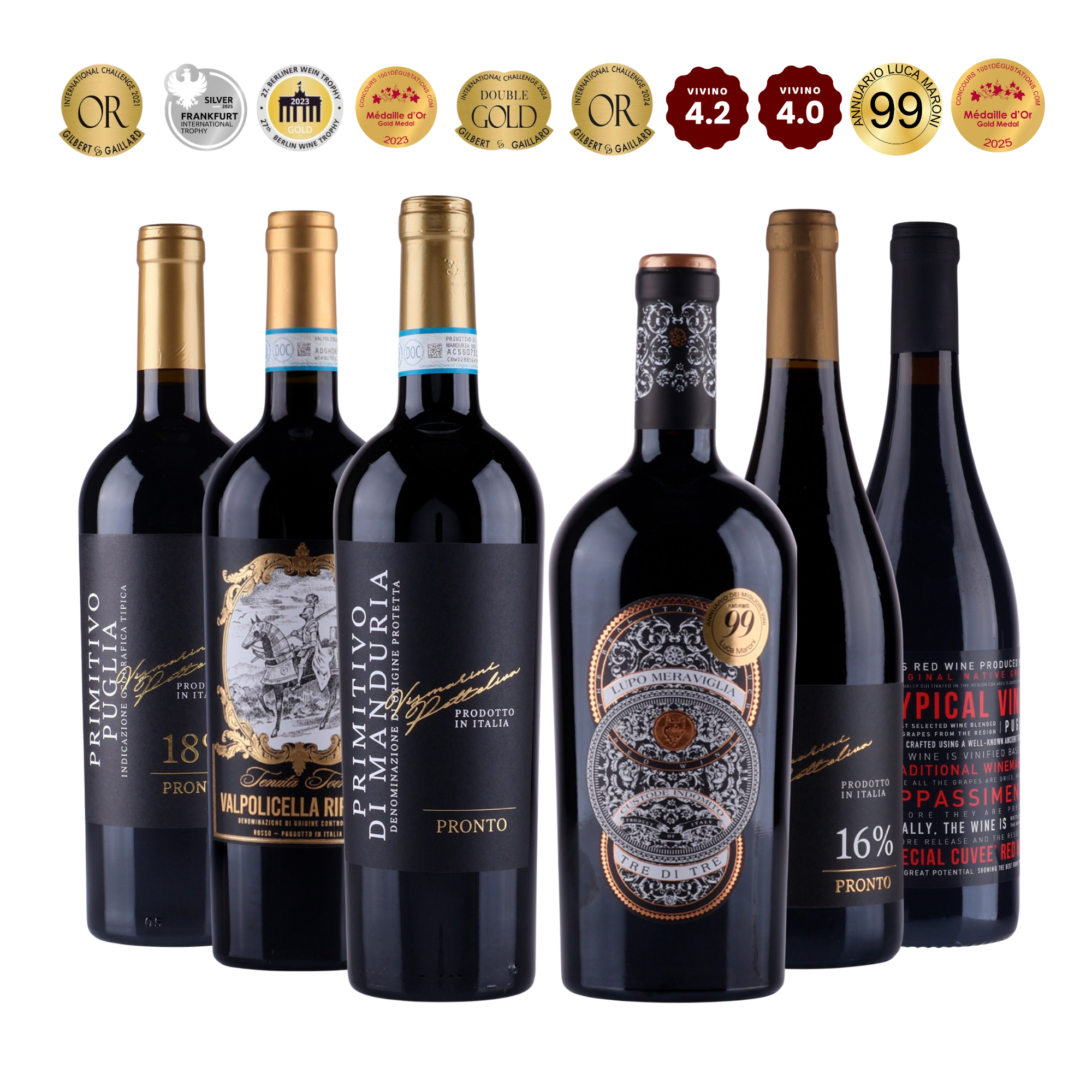 Lådan innehåller sex noggrant utvalda viner - främst från Apulien, känt för sina intensiva Primitivo-viner, kompletterat med en elegant Valpolicella Ripasso från Veneto. Här får du prisbelönta viner med höga Vivino-betyg, mörk frukt, mjuka tanniner och lång eftersmak.